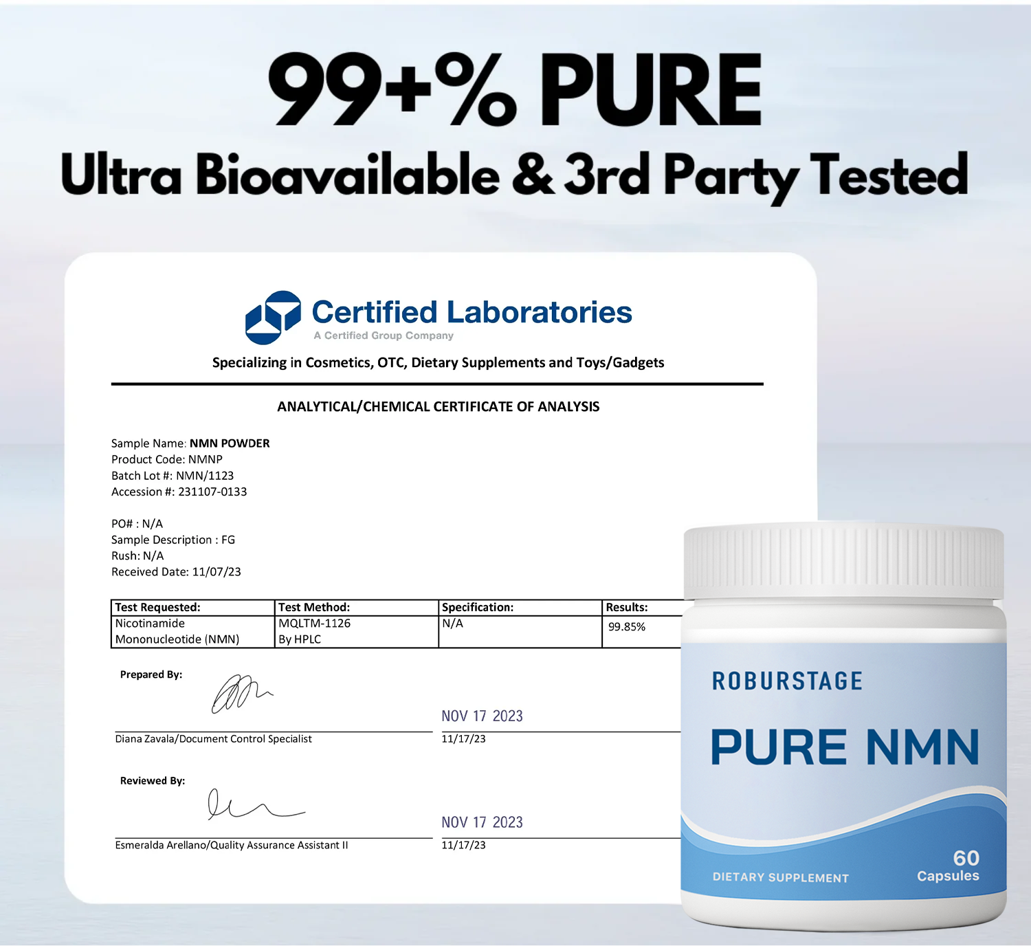At Roburstage.com, we don’t just follow longevity research… we lead it. Our 99.8% pure NMN is trusted by world-leading scientists and actually used in clinical trials as the gold standard of purity and performance. Unlike many NMN supplements that hide behind fake purity certificates and diluted formulas, we independently verify every batch to ensure you get the highest quality, most bioavailable NMN available today.